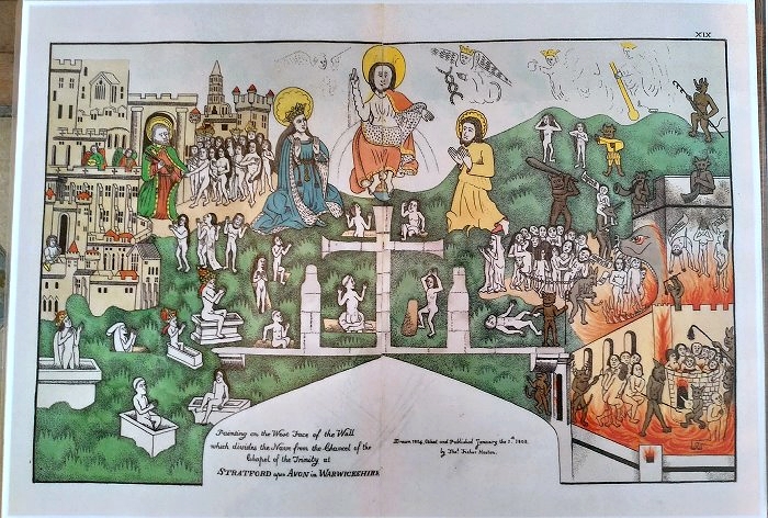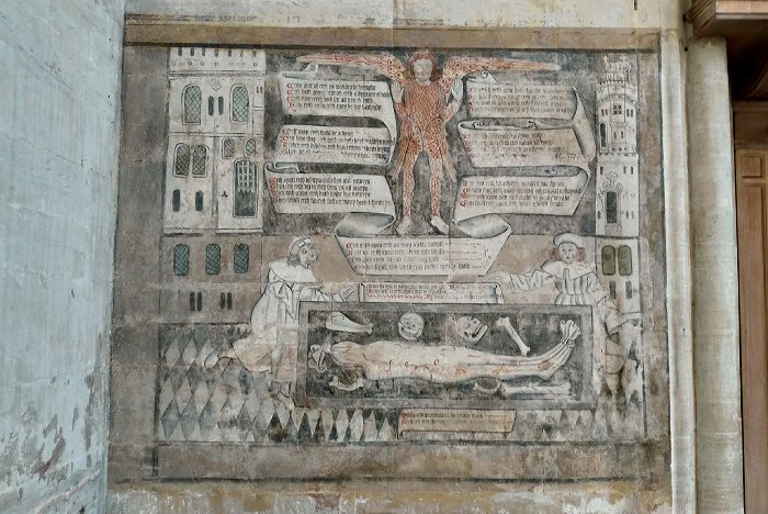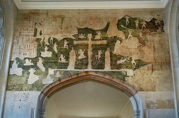 圖為當時尚未修復的壁畫,描繪了聖徒、天堂和地獄之門,以及其他當時所流行對來世的觀點。