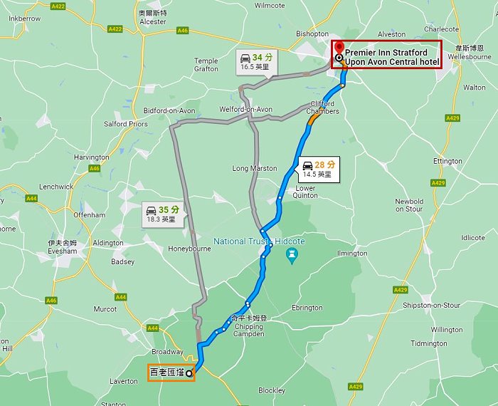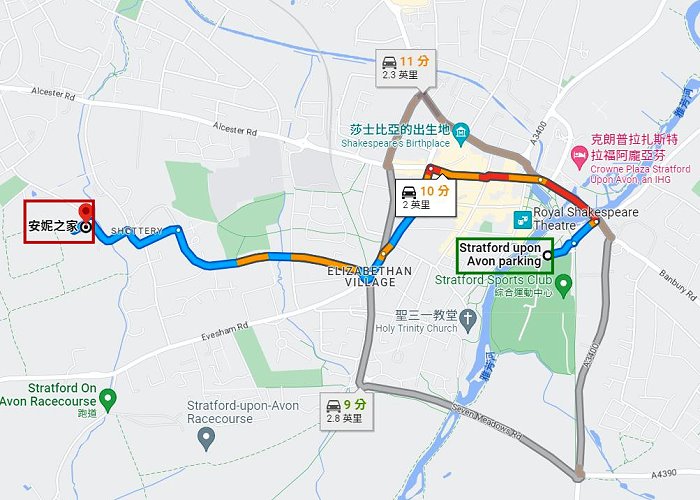 自百老匯塔驅車前往亞芬河畔史特拉福(Stratford-upon-Avon),車程半個小時左右。