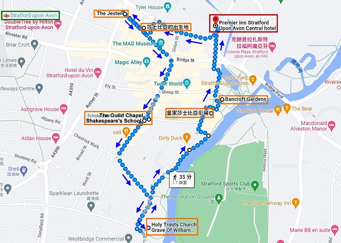 Stratford-upon-Avon散策路線。↑圖中左側從莎士比亞出生地至聖三一教堂,即為「Stratford’s Historic Spine」步道的部份。本文圖多,敬請耐心神遊。