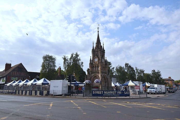 市集廣場上的鐘樓噴泉,為「莎士比亞紀念噴泉(The Shakespeare Memorial Fountain)」又稱「美國噴泉(The American Fountain)」,高18公尺,建於1886~1887年,為獻給莎士比亞和慶祝維多利亞女王登基禧年的紀念鐘樓。