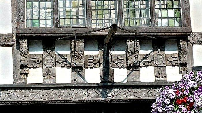 房子正面刻有托馬斯·羅傑斯(Thomas Rogers)和他第二任妻子愛麗絲(Alice)的姓名首字母縮寫,以及日期 1596。