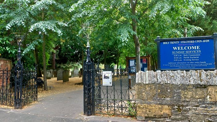 聖壇前方的地板上用黑線圍出的莎士比亞之墓(圖引維基百科,photo by David Jones),莎士比亞於 1616 年被安葬在聖壇前方之處,墓碑上沒有刻上莎翁之名,只有代替墓誌銘的一首韻詩。但經過科學研究顯示莎翁的頭骨居然不在墓中!以雷達探測也沒有在墓葬區發現任何金屬,例如螺釘等。專家由此認為,莎士比亞和他的家人沒有在棺材裡下葬,而是只有「衣冠塚」(資料參考網路)。