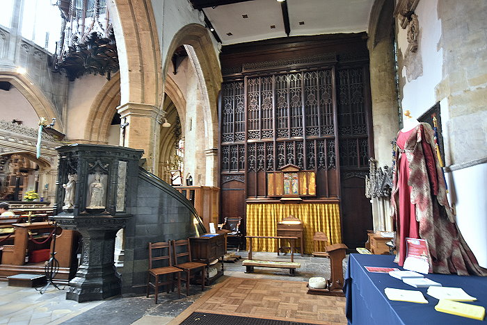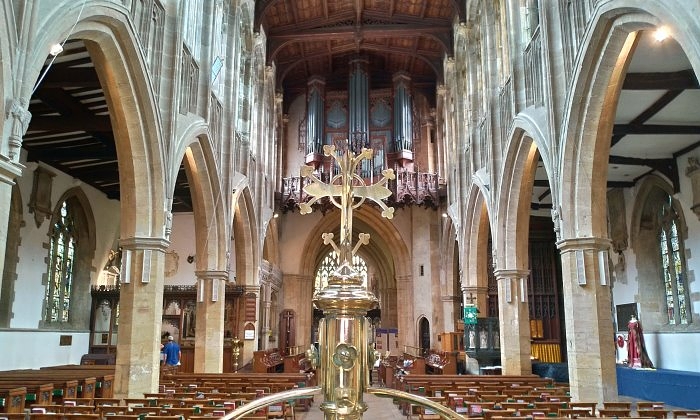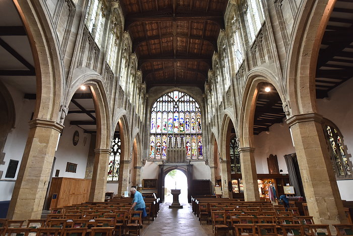 中殿是教堂最大的部分,14 世紀的垂直石柱上有雕刻石天使為特色風格,將目光引向天窗,這些天窗安裝於 1490 年代,幾乎所有的玻璃都是原裝的,可讓自然光進入建築物。