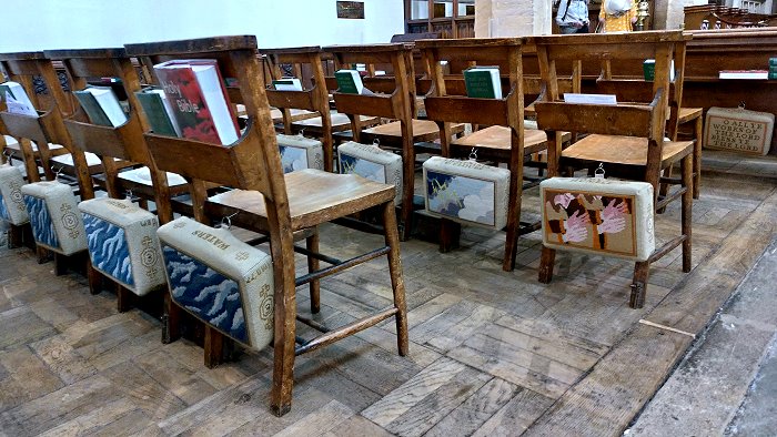 禱告的座椅也掛了跪枕,圖案都是繡出來的。