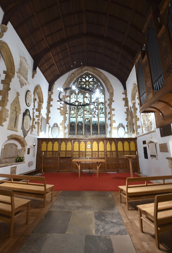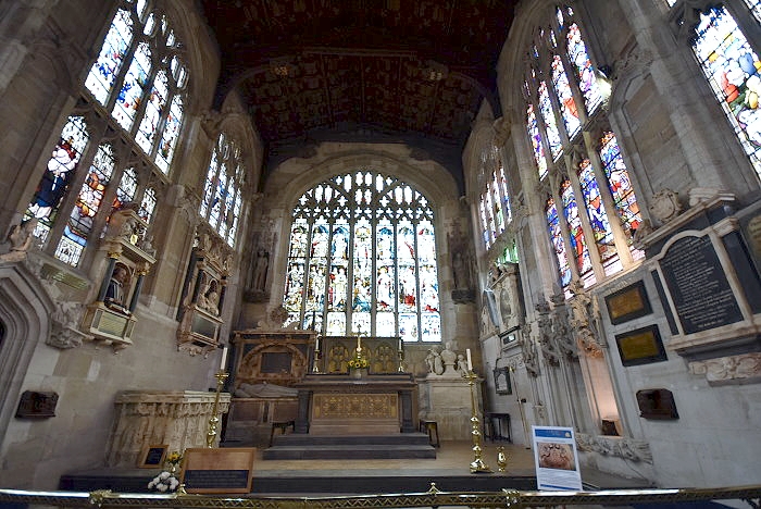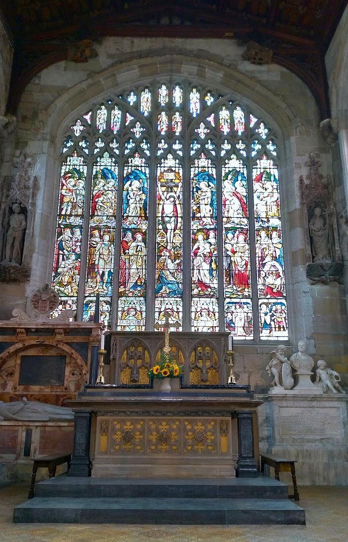 聖壇與西面彩繪玻璃窗。大型彩繪玻璃窗展示了主要的英國和聖經聖徒。