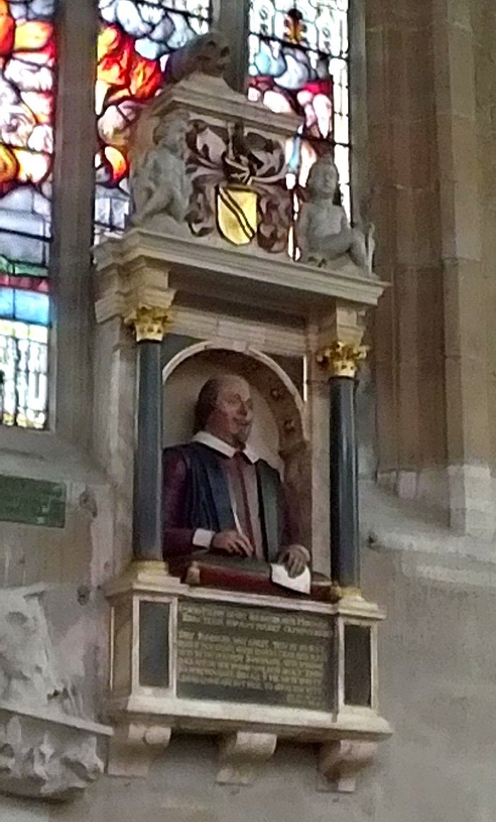 莎士比亞紀念碑,位於聖壇北牆上。據說這是蓋拉特·詹森 (Gheerart Janssen) 的作品,他塑造的莎士比亞是一個略胖的禿頭男人,把手放在流蘇墊子上,一手拿著筆,另一手放在一張紙上。