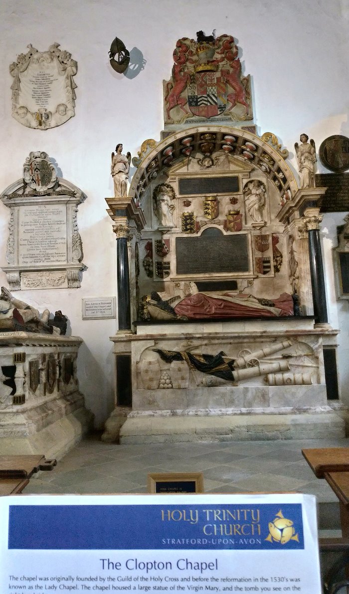 克洛普頓禮拜堂(The Clopton Chapel),為紀念休·克洛普頓 (Hugh Clopton)所設的家族禮拜堂。中間為休·克洛普頓 (Hugh Clopton)之墓,其實是空的,安葬於倫敦;左為喬治·卡魯(George Carew)和他的妻子喬伊斯·克洛普頓 (Joyce Clopton)之墓。