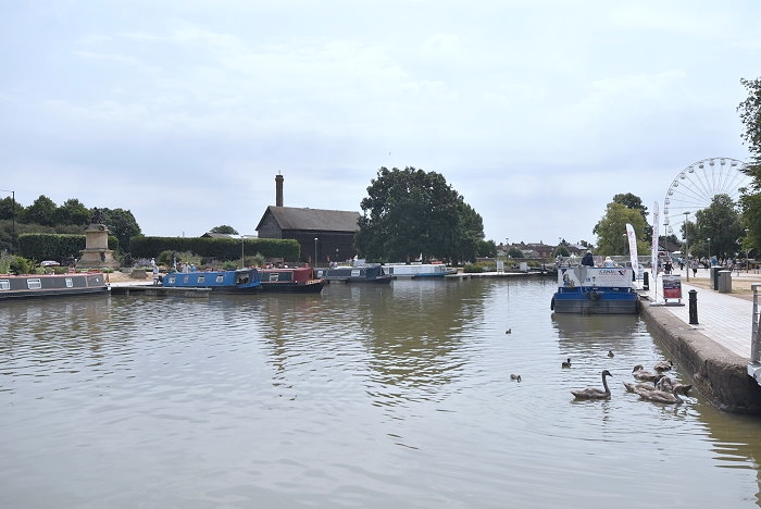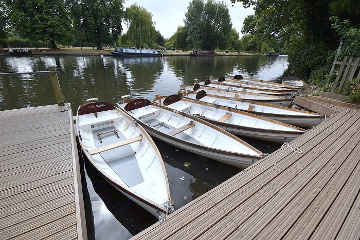 班克夫特花園(Bancroft Garden)旁的運河碼頭,這裡可以搭船優遊亞芬河。左方灰、藍、紅等顏色的船隻則為船屋商店;其後岸邊有座莎士比亞雕像。