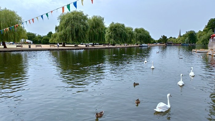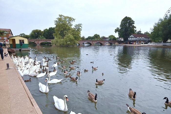 亞芬河裡成群結隊的天鵝與水鴨;不遠處的克洛普頓橋(Clopton Bridge),一座具有 14 個橋拱的中世紀晚期磚石橋,初建於 1484 年左右,是一級保護建築和指定古蹟。