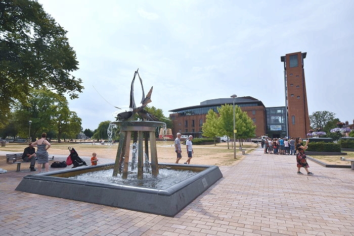 皇家莎士比亞劇院前的「班克夫特花園(Bancroft Garden)」天鵝噴泉。這座公園有寬闊的草坪和參天大樹,是居民與遊客休閒好去處。