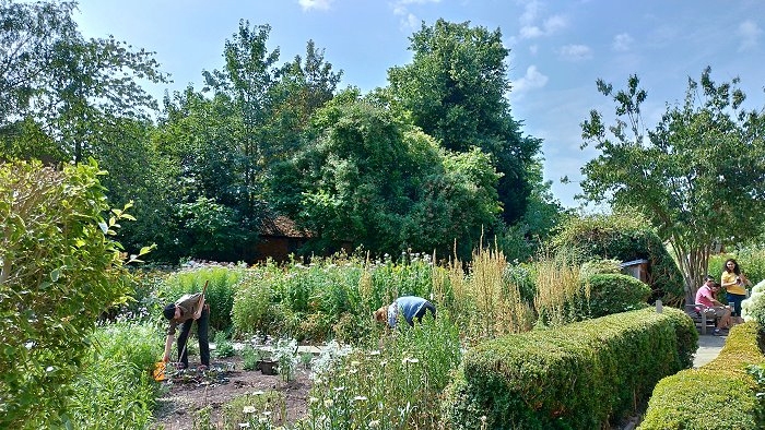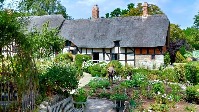 根據資料:1920 年,園藝師Ellen Willmott受莎士比亞出生地信託基金會的委託,對周圍花園的設計和種植提出建議。她對花園和果園設計旨在與建築物相得益彰,所選的許多植物都在莎士比亞的戲劇中被提及,讓花園一年四季皆呈現色彩繽紛的風貌──為了維護花園的生氣盎然,可以看見不少工作人員忙碌的身影。