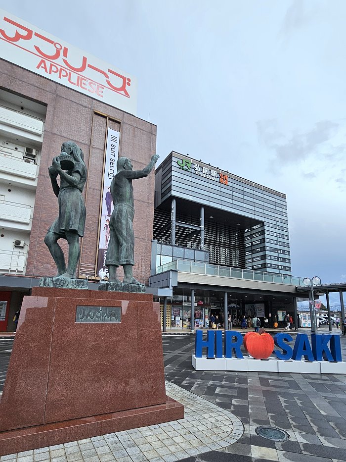 弘前駅前広場上的《りんごの風》銅像,為弘前市出身的雕刻家古川武治之作。