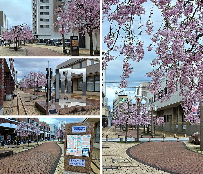 弘前駅通往上土手町之歩道「えきどてプロムナード(車站步道)」,植有仙台的伊達屬八重垂枝櫻正盛開,步道上還有多件藝術作品,整體規劃極為完善,夏季每週日還會舉辦朝市。
