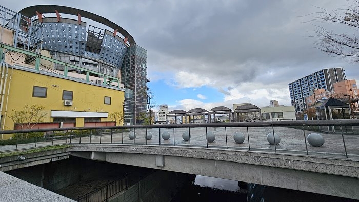 途經「蓬莱広場」,左方特殊造型的建築為在東北地區經營之老百貨公司「中三(なかさん)弘前店」,已因破產於2024年8月底歇業。
