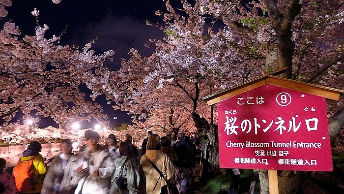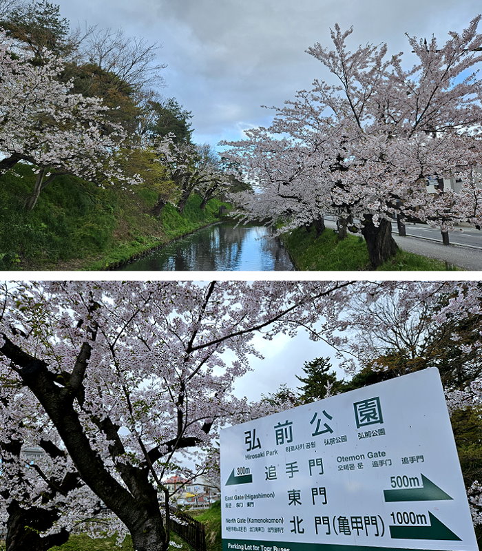 弘前公園外濠染井吉野櫻盛開,依指標往追手門方向前進。