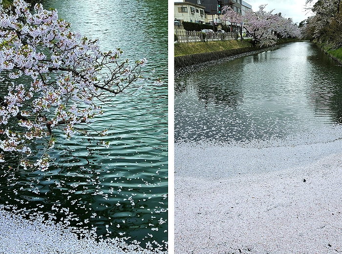 櫻花瓣落於水面形成「花筏」,尚未鋪滿整個水面,加上陰霾天色影響,完全沒有浪漫之感。