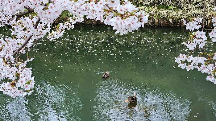 外濠的櫻花樹滿開,粉櫻垂映綠水。