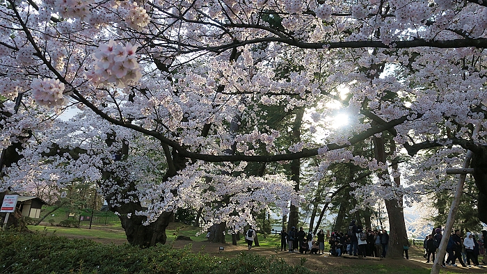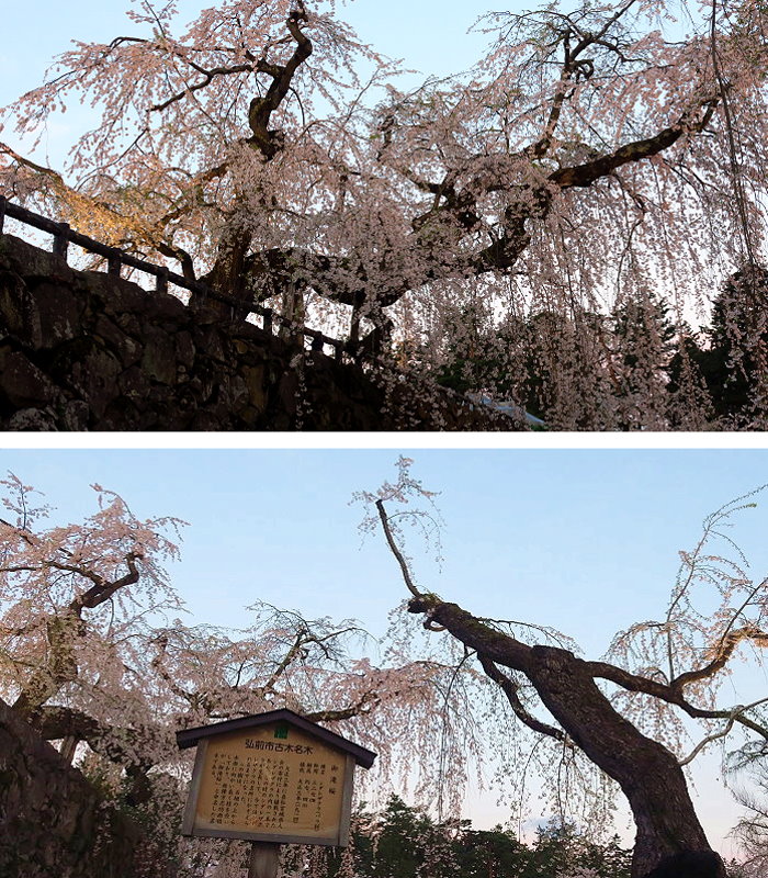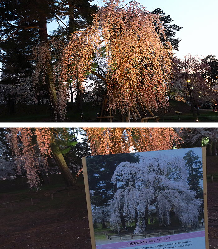 二の丸大シダレ(櫻名:シダレザクラ),植於1914,為弘前公園內最大的百年櫻花。這棵大枝垂櫻在2011年被大雪連根壓垮,之後園方在四周以木架支撐,經過長期的復育計畫,至今又繁花盛開如瀑。