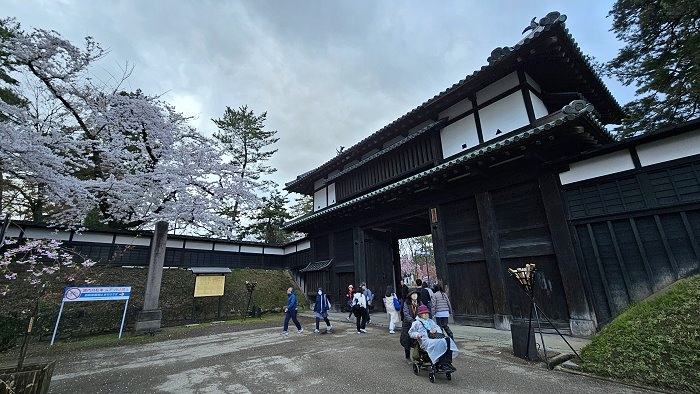 追手門,為「三之丸」的櫓門之一,在白牆上可見防禦用的三角形槍孔(銃眼);這座門也是弘前城公園的主要入口。