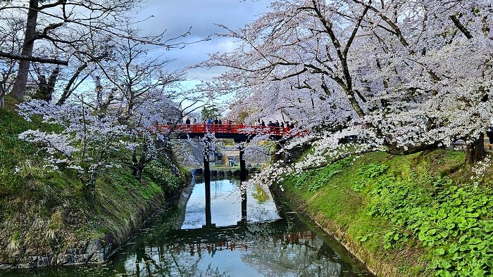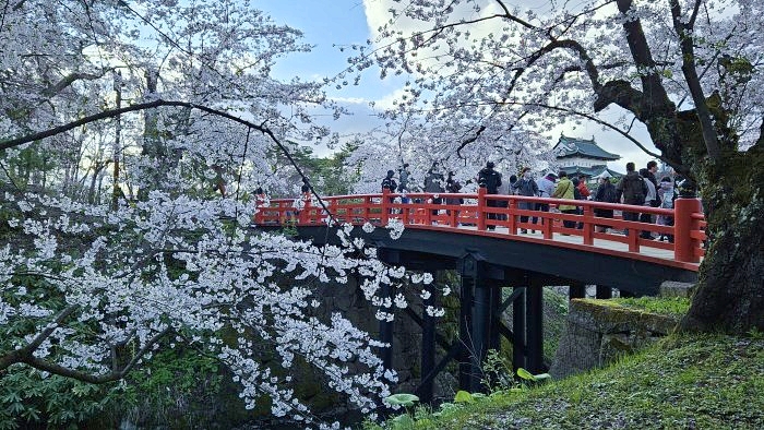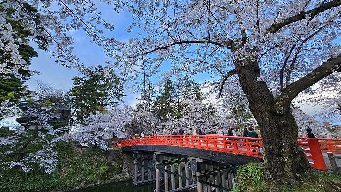 染井吉野櫻環繞橫跨中濠的紅色「杉の大橋」。上午持續陰雨天氣,至午後進到弘前公園終於放晴,可喜可賀!