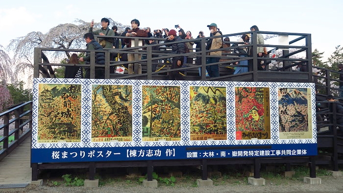 臨時展望台入口側邊,展示著藝術家棟方志功歷年來所設計「弘前さくらまつり(弘前櫻花祭)」的海報。