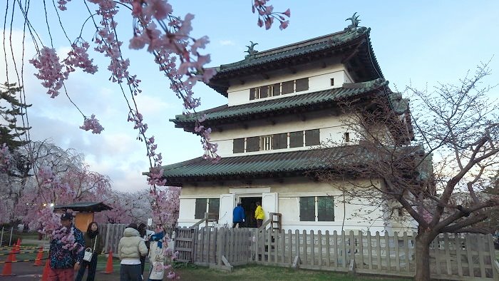 目前殘存的三層天守閣,是由弘前藩第九代藩主津軽寧親於文化7年(1810年)建造,高14.4公尺獨立式3重3層塔型構造,是日本現存12天守閣中,在東北地區唯一倖存的天守閣,雖然規模不大,但卻被認為是日本江戶時代最具代表性的天守閣之一,弘前城的江戶時代建築群於1950年被定為國家重要文化財。