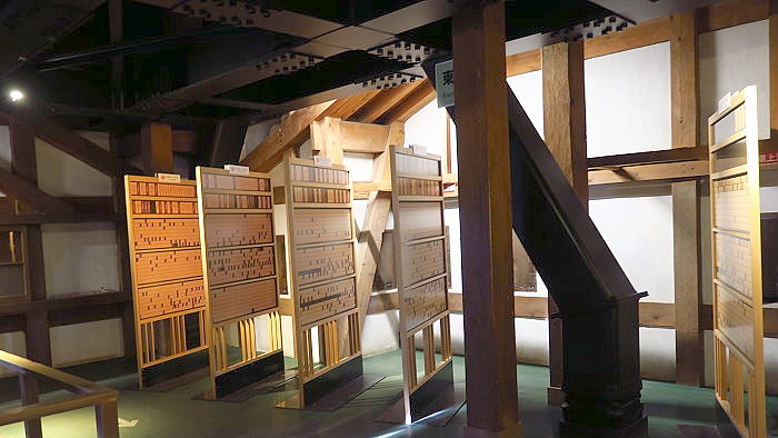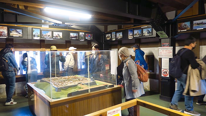 天守內部展示弘前城本丸復原模型,四周牆上懸掛「日本100名城」的圖片。