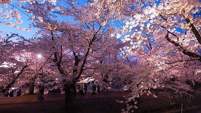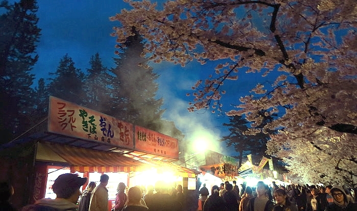 波祢橋右側往賀田橋方向,櫻花樹下成排的的露天攤販熱火朝天、人潮洶湧。