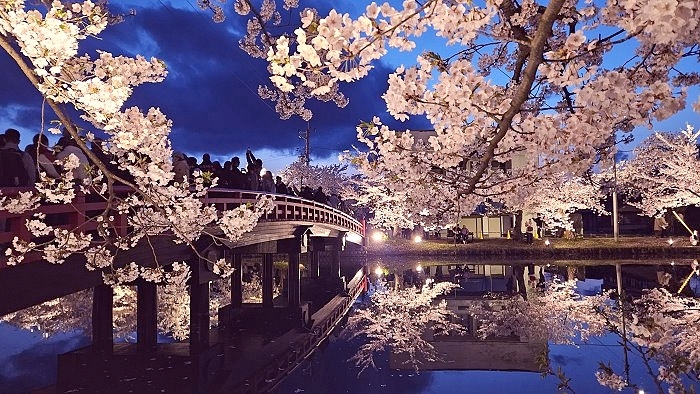 春陽橋,橫跨西濠之上,建於1932年,為了方便市民通行而架設,也是弘前城內最長的橋。西濠沿岸的櫻花隧道是著名的賞櫻勝地,春陽橋為最熱門的拍攝據點,可以看到橋上滿滿都是人。