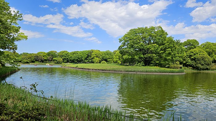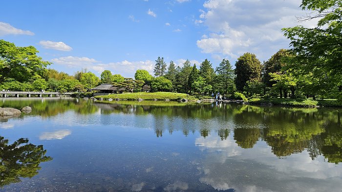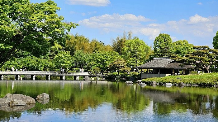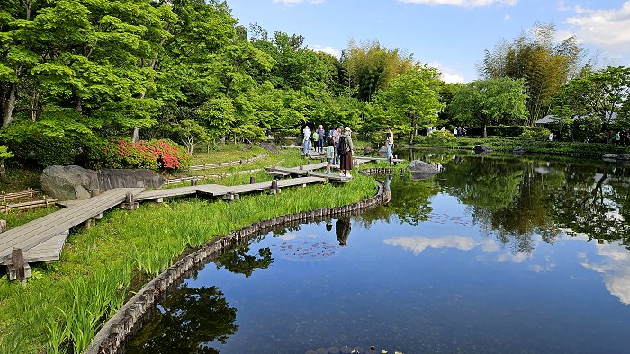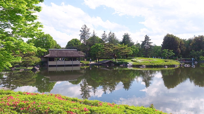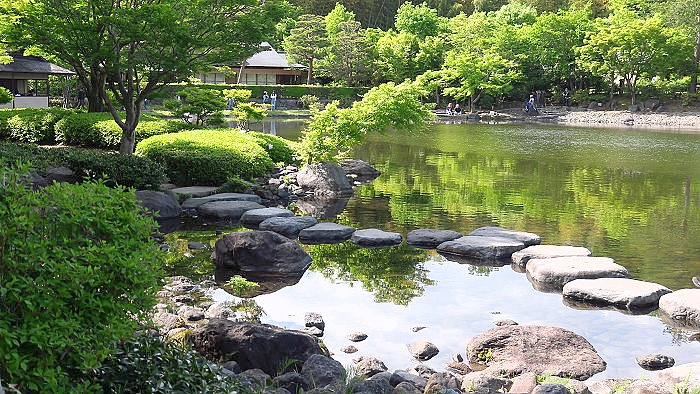 日本庭園,為了紀念天皇與皇后結婚而建造,由園藝家榊原八郎採用江戶時代發展出來的「池泉回遊式庭園」景觀風格設計,佔地6公頃,是東京都內最大的日式庭園,於1997年建成開放。