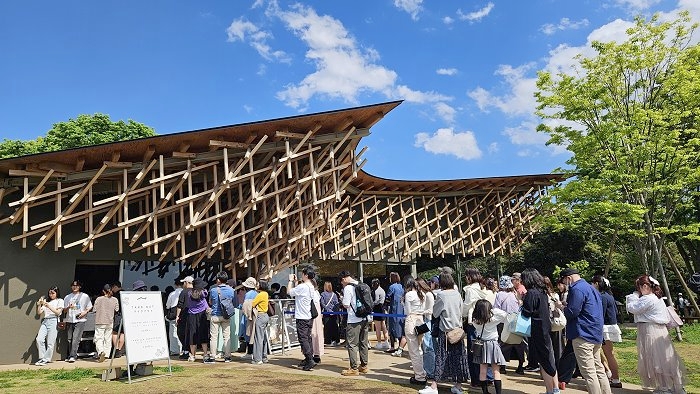 「OKA CAFE」的咖啡店,外觀使用多摩產的杉木材建構成傳統組木格子,彰顯著隈研吾設計的獨特風格。