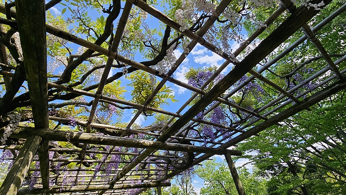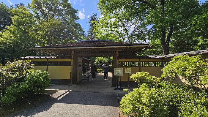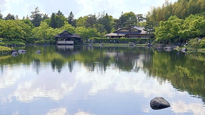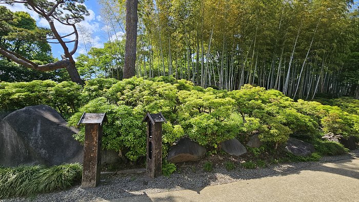 日本庭園外圍種植橡樹、錐栗等常綠喬木,以及遮蔽周圍建築的毛竹,營造出與日常生活隔離的獨特庭園空間。
