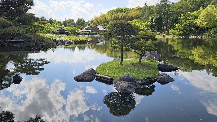 池中的「龜形島」,其上種植的松樹象徵著「鶴」。