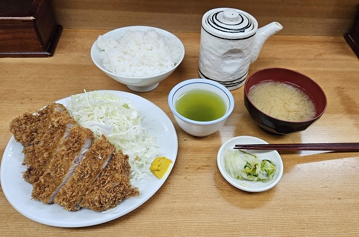 點了最基本的「ロースかつ定食(900日元)」,附上綠茶、醃漬小菜和味噌蜆仔湯。