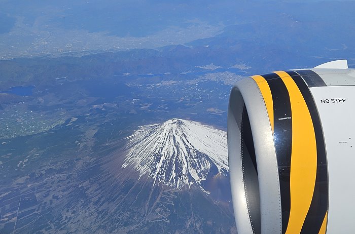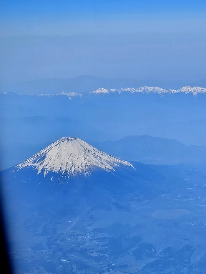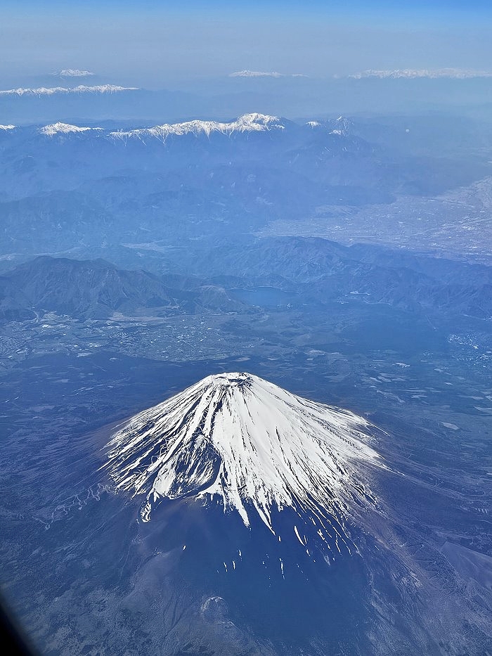 暮春時分,富士山白雪覆蓋火山口與山稜線,歷歷在目。