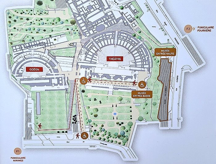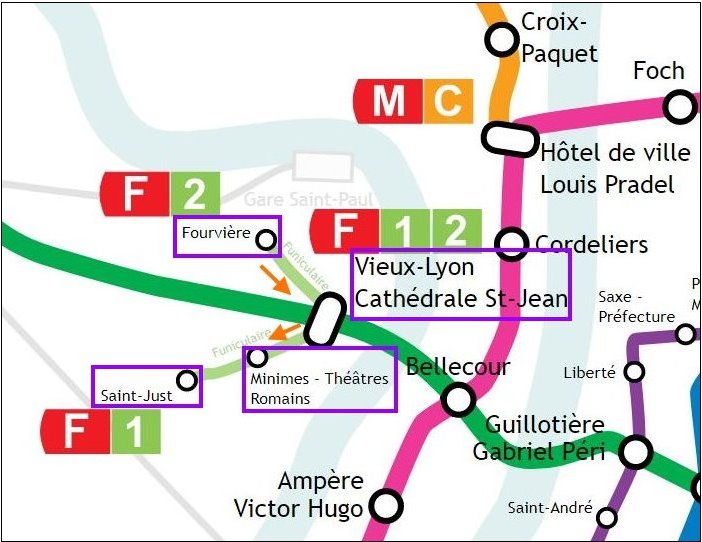 從富維耶聖母院步行至富維耶山古羅馬劇場不到600公尺,不過去的當時日頭赤燄燄,加上已經買了24HR交通卡,所以決定還是搭乘纜車前往。從Fourvière站搭乘F2纜車到Vieux Lyon Cathédrale Saint-Jean 車站,再轉F1纜車至Minimes Théatres Romains站下車(圖截自Tranports en commun à Lyon官網)。