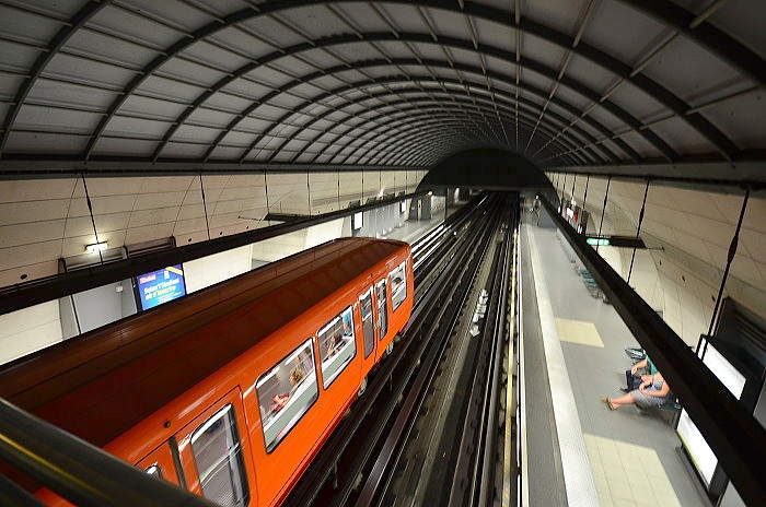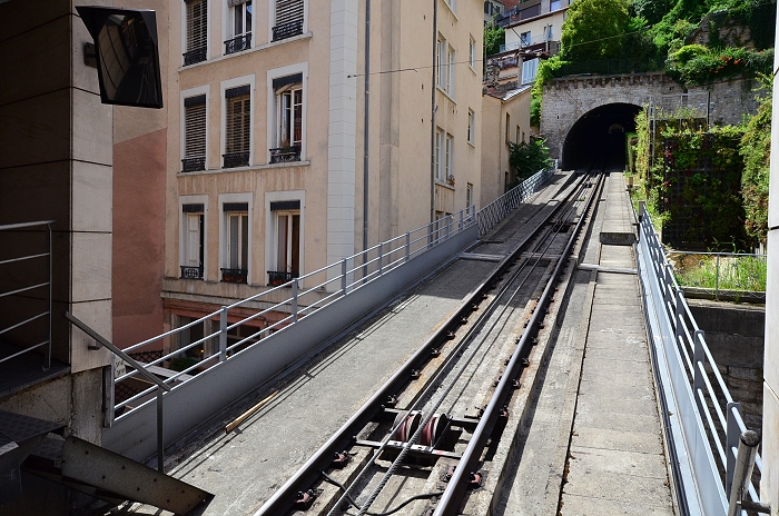 隧道式的Saint-Just車站外觀與纜車軌道,可清楚見到軌道間作為動力的鋼索纜繩。