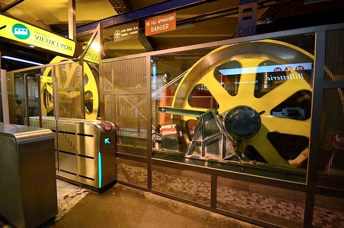 位在Vieux Lyon車站內巨大纜繩驅動輪。