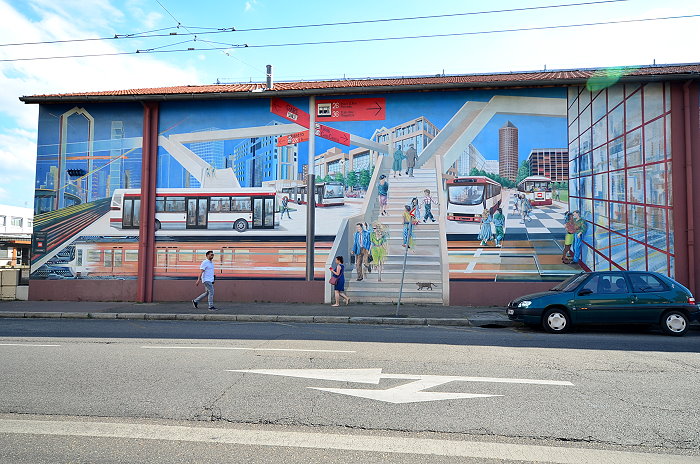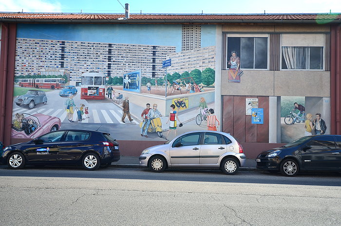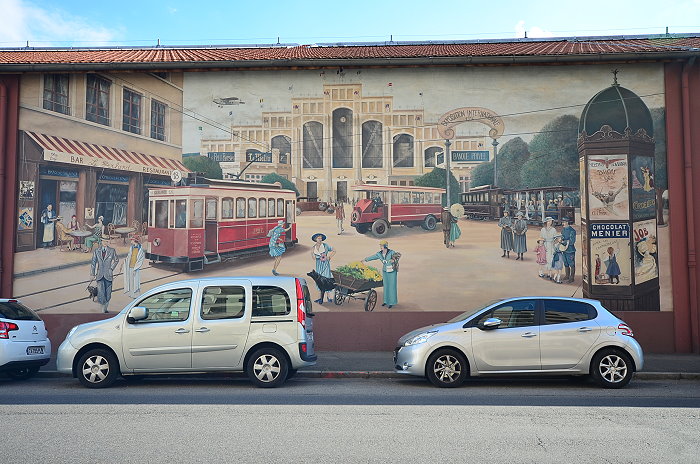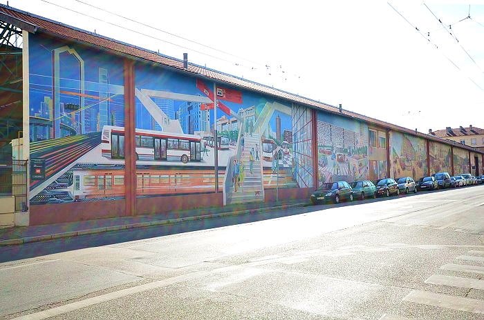 巴士車站外牆《城市之旅(Voyage dans la ville)》壁畫,由Cité Création團隊於1989年創作,面積達720平方公尺,由7個部分組成,內容呈現里昂公共交通的演變,從1855年的馬車到20世紀70年代的地鐵等不同時期的交通方式,到對未來的展望。