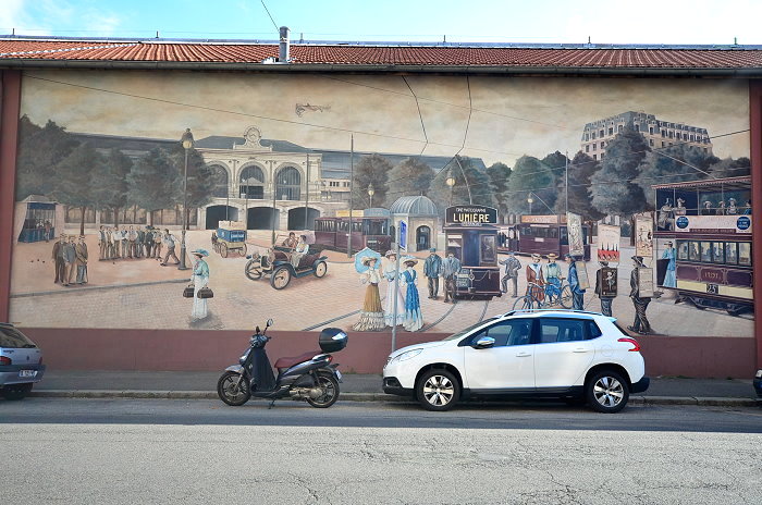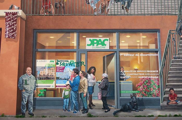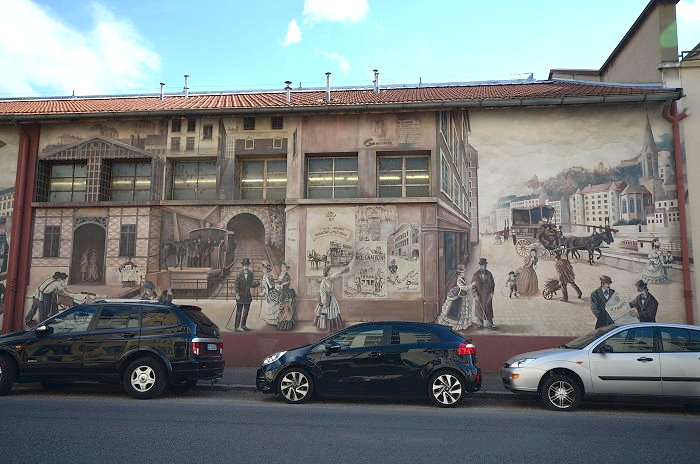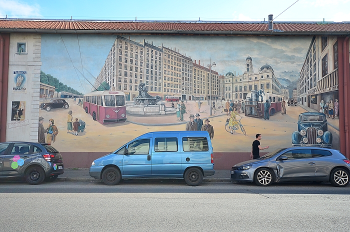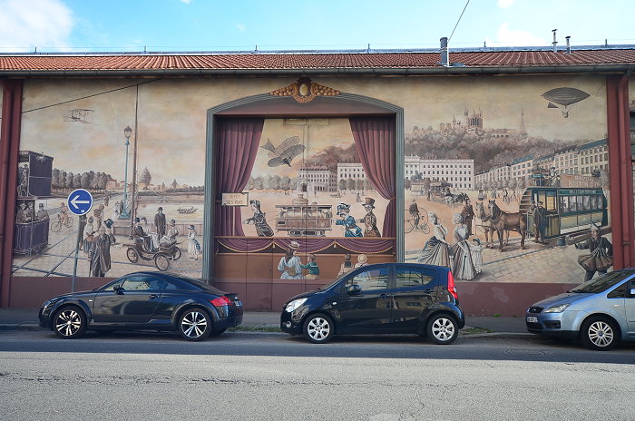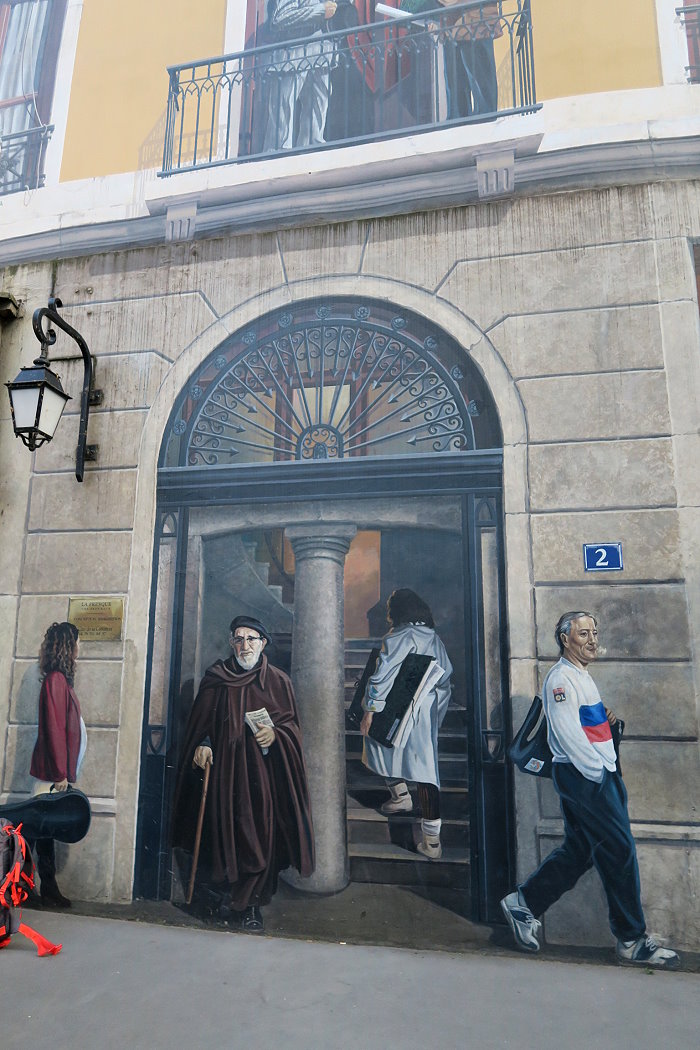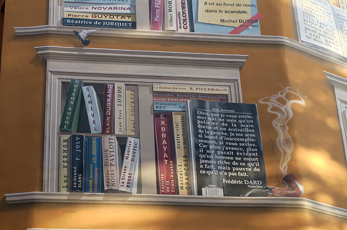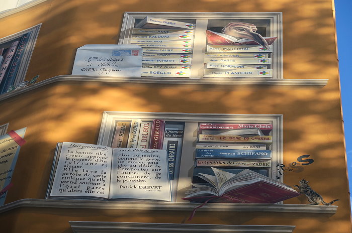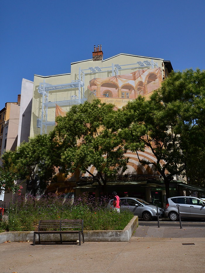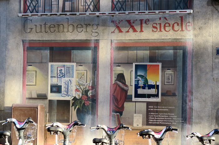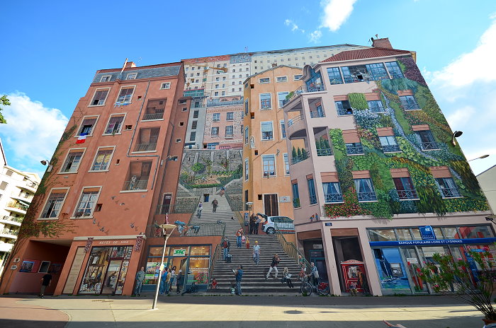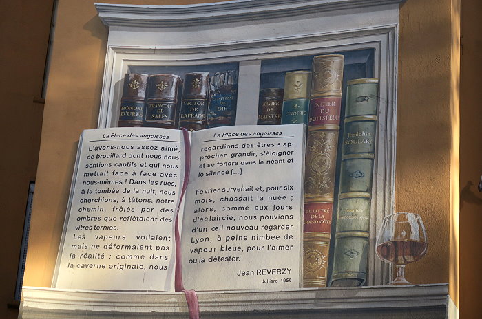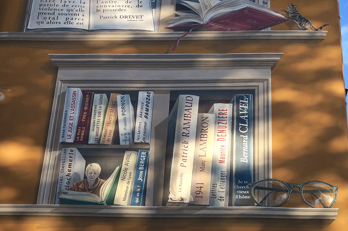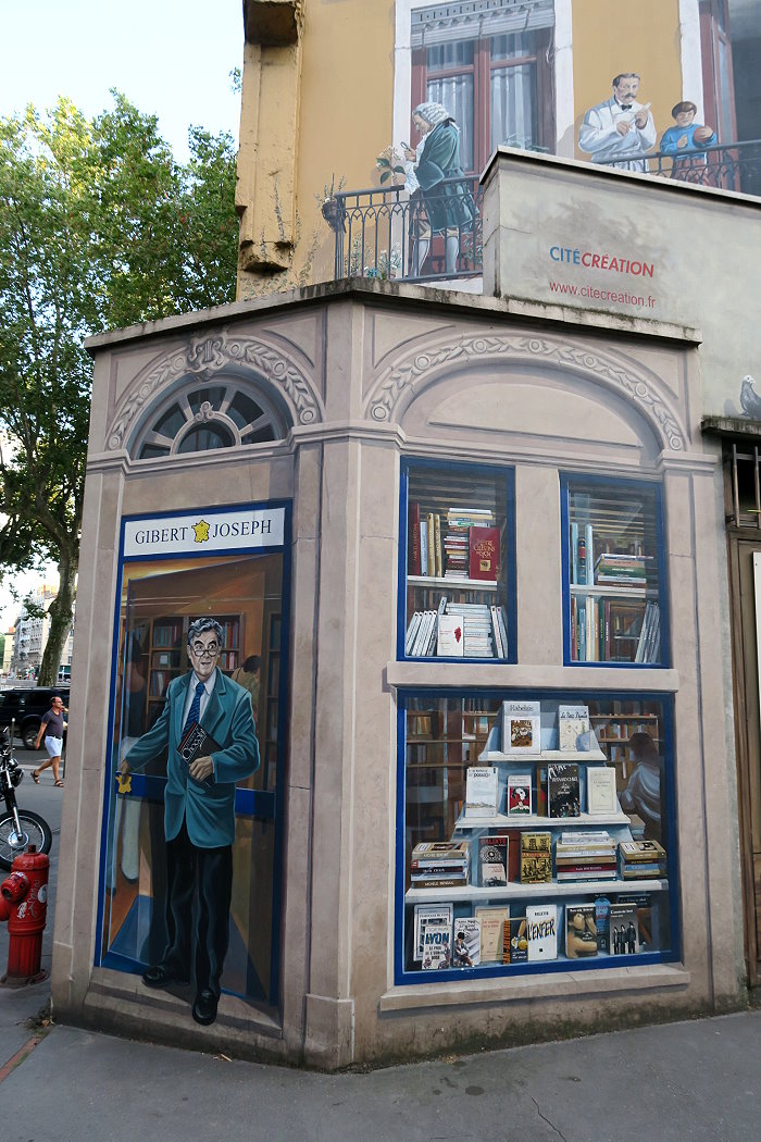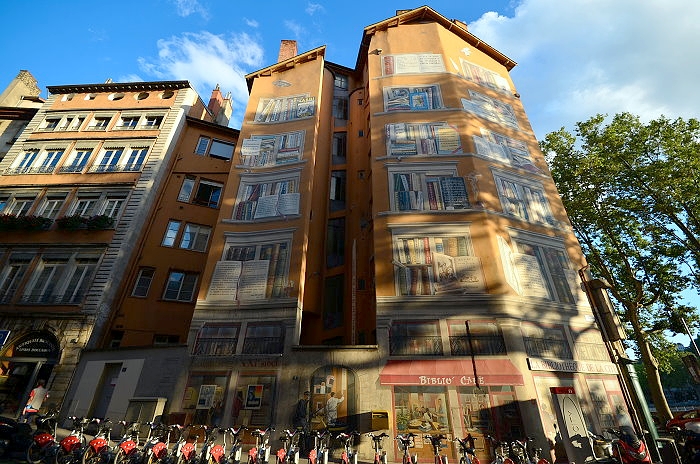 《城市圖書館(La Bibliothèque de la Cité)》,位在索恩河(Saône)河畔,6層樓約400 平方公尺的牆面由CitéCréation團隊於1998年繪製,描繪有如一個巨型的戶外圖書庫,主題是關於 Rhône-Alpes 區域的書籍,約莫有 500 冊。咖啡館必須與圖書館密不可分,一樓就有間「Biblio Café」咖啡館。