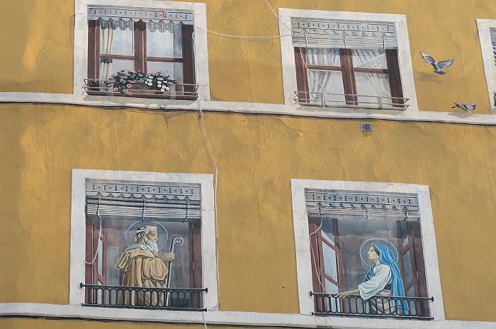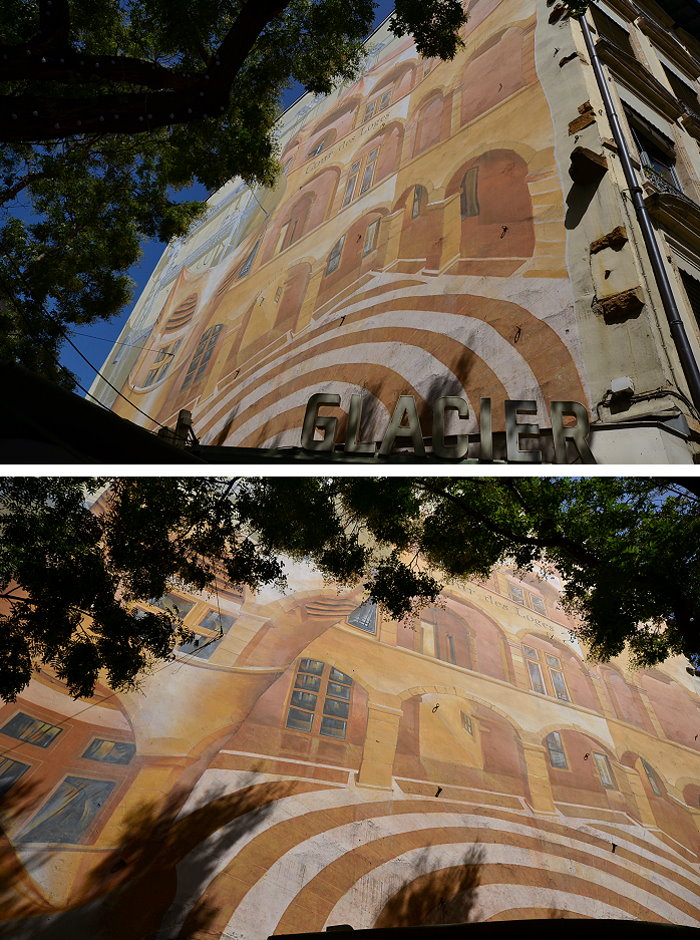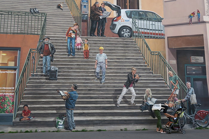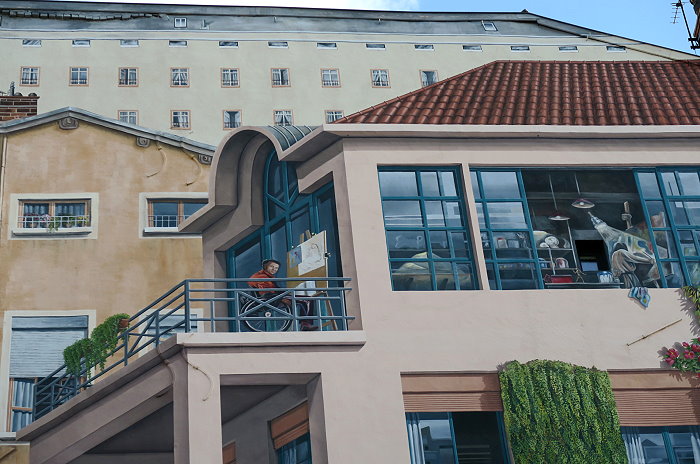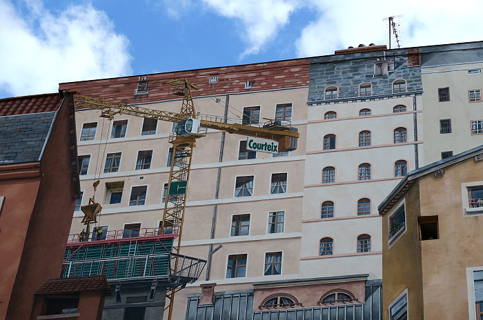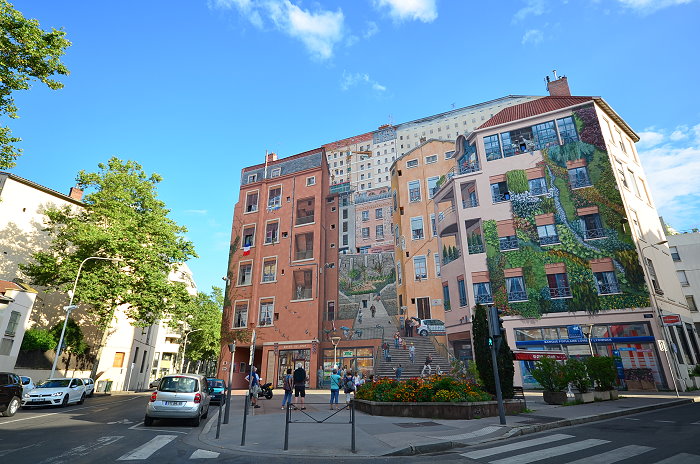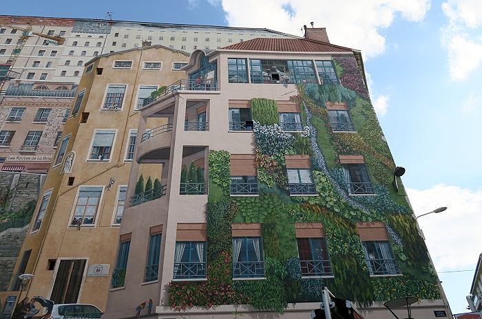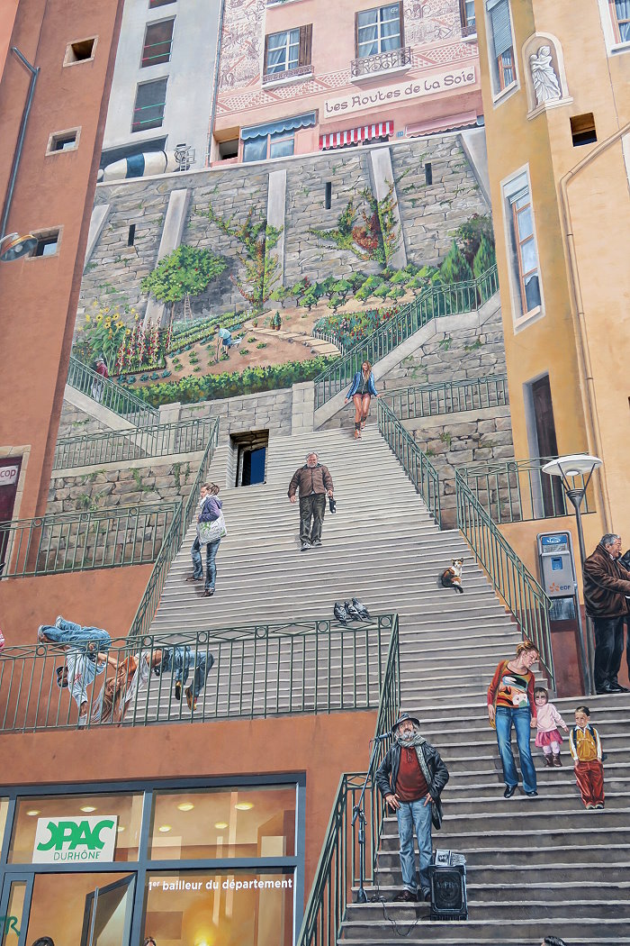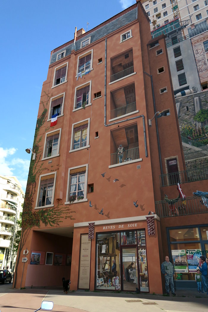 《絲綢工人之牆(Mur des Canuts)》壁畫繪製在一塊沒有窗戶的牆面,面積達1200平方公尺,是CitéCréation團隊於1987年繪製的歐洲最大錯視畫(Trompe loeil)之一。畫面展現一幅高樓大廈和山丘的場景:以三分的錯視形式呈現,中間的斜長階級把左右的樓房分隔開,尤如一個小社區,並以絲綢紡織工人穿插於壁畫中。