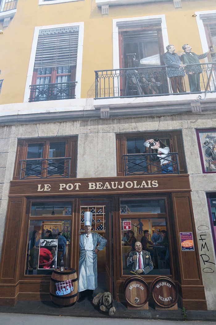 站在店門口的是20世紀最偉大的廚師之一 Paul Bocuse ,右邊舉杯的是法國作家Frédéric Dard;樓上是發明第一部電影放映機的 Auguste et Louis Lumière。