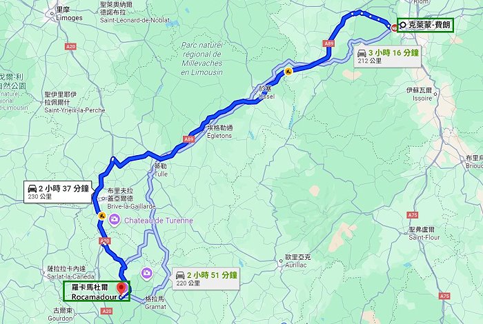 從克萊蒙費朗(Clermont-Ferrand)驅車前往羅卡馬杜爾(Rocamadour)約220公里,實際花了3個多小時車程。