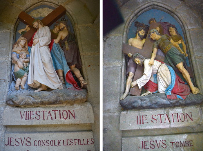 Chemin de Croix之字型的每個轉折點都設有石龕,共14座呈現耶穌受難場景的雕塑。