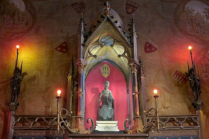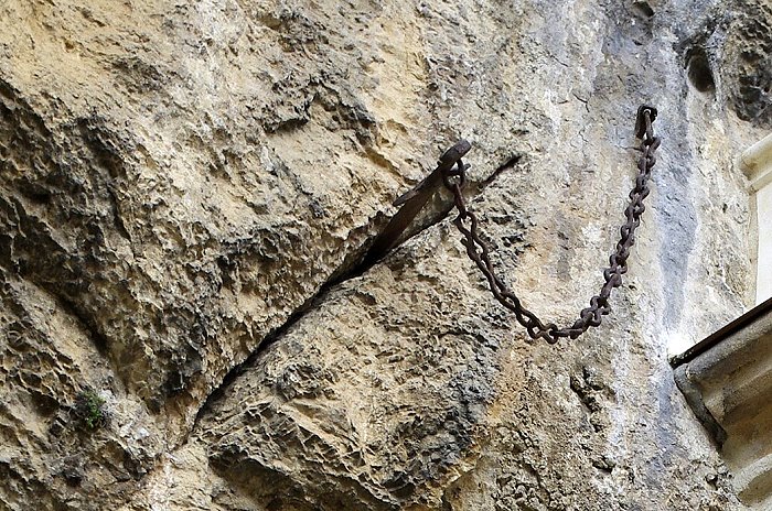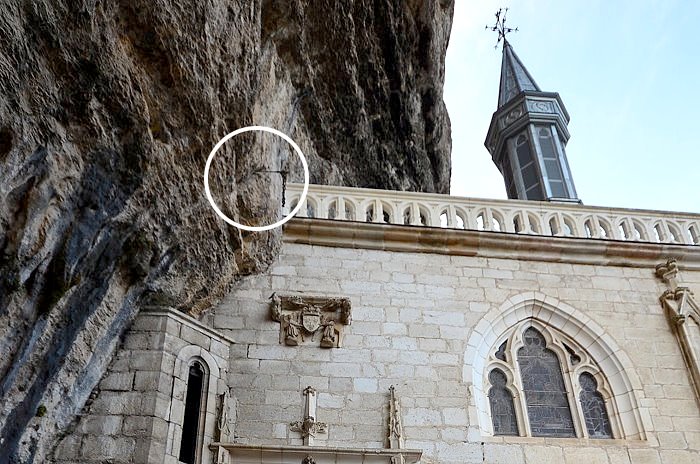 聖母禮拜堂左上方岩壁插著一把「羅蘭之劍(Roland Durandal)」(見白圈處)。