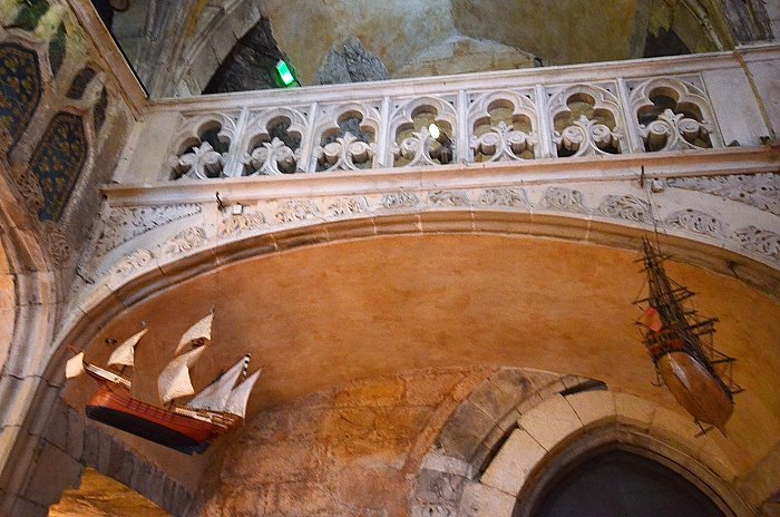 懸掛著船隻模型,信徒還願之物:19世紀的漁船和18世紀末的護衛艦模型。