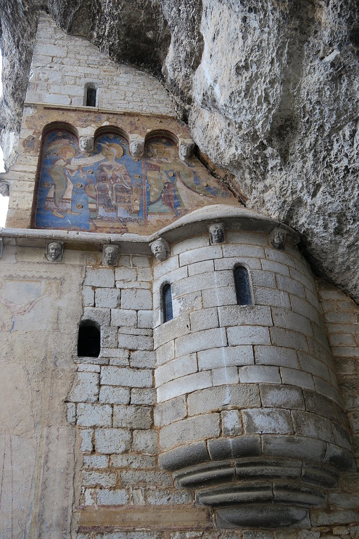 聖米歇爾禮拜堂(Chapelle Saint-Michel)外牆。這座禮拜堂位於羅卡馬杜爾所有宗教建築中最高處,鑿建在岩石上,沒有屋頂,也沒有西牆,中世紀的朝聖者無法進入,因為它僅供本篤會修士使用。