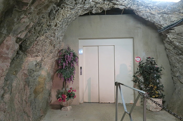 位在岩石隧道裡的下層「Ascenseur de Rocamadour Lift RocamA」垂直電梯外觀。