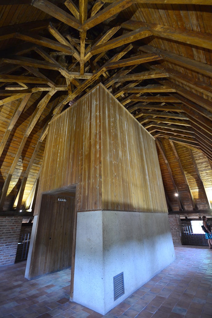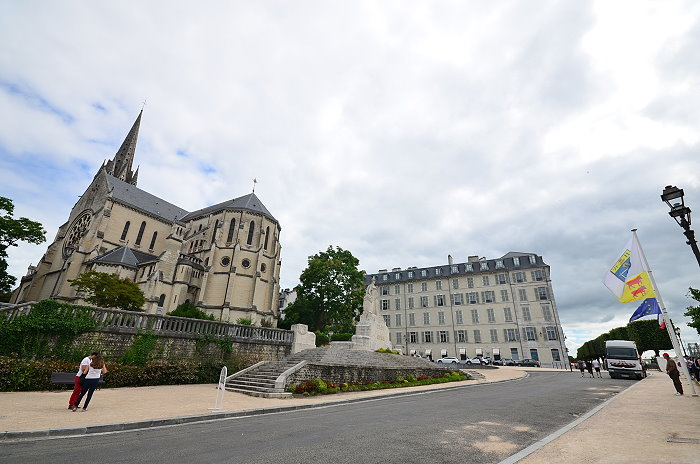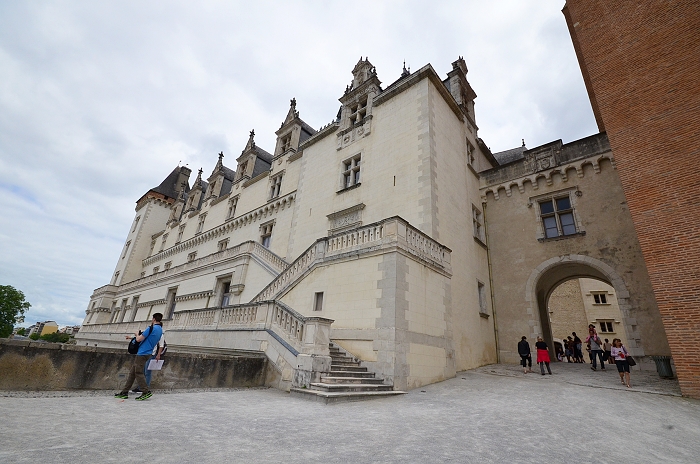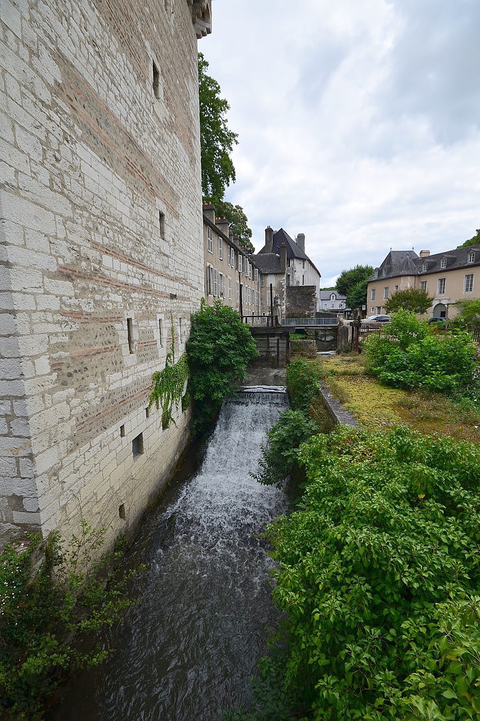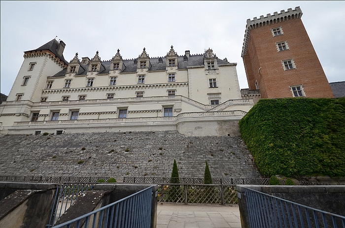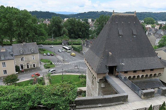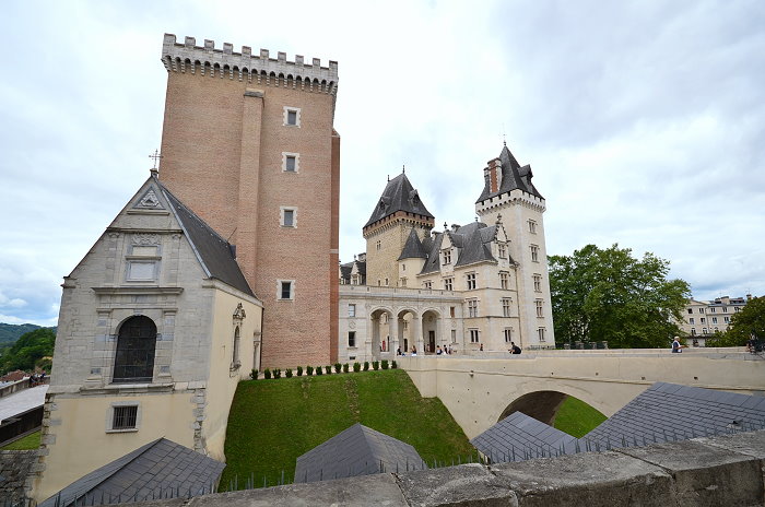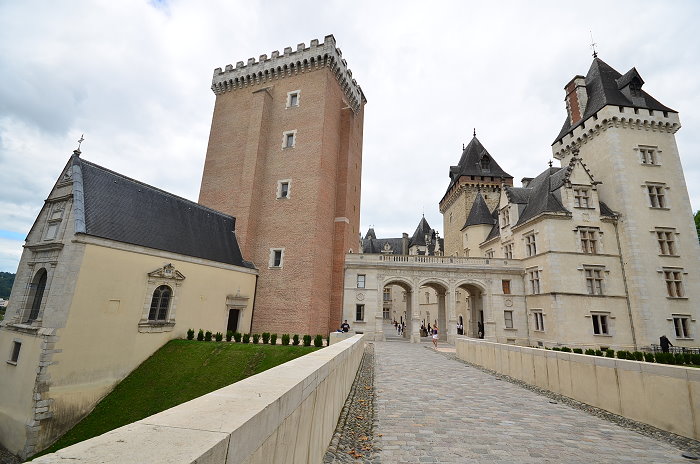 左前方建築為教堂(Chapel),磚造有垛口的城堡塔為波城城堡主樓,又稱為「加斯頓-費布斯塔(Tour Gaston-Fébus)」,初建於14 世紀末,19世紀因毀於暴風雨而重建,高 33 公尺;從16世紀到1822 年曾被用作監獄,因此也被稱之監獄塔。