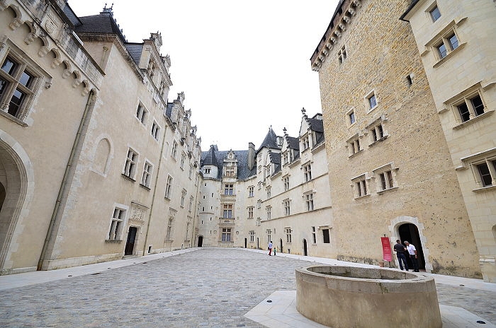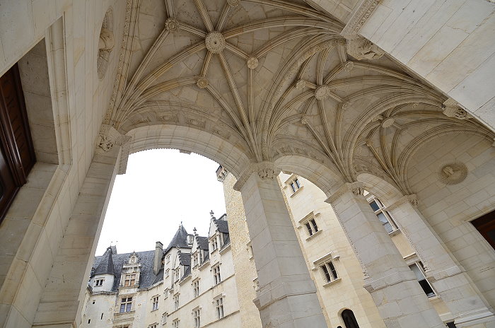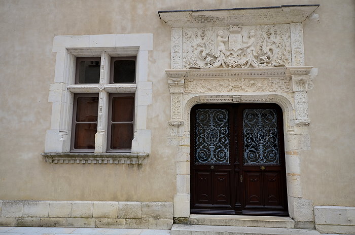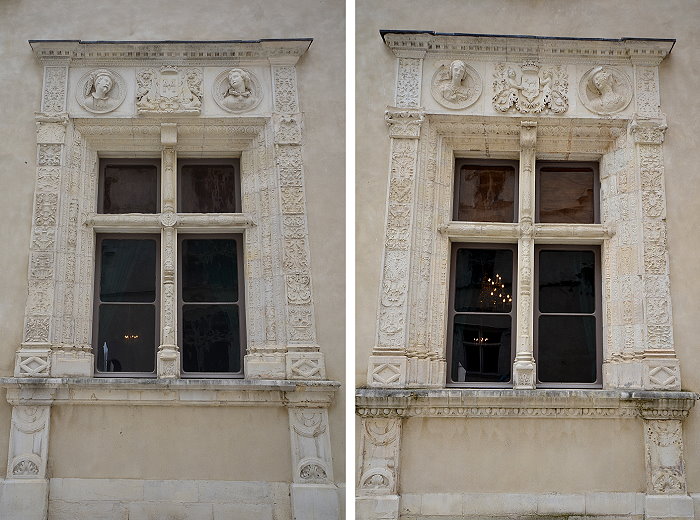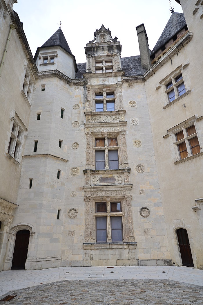 文藝復興風格窗戶上華麗細膩的雕刻,窗戶柱頂上,當中有貝亞恩(Béarn)皇室徽章的雕刻。